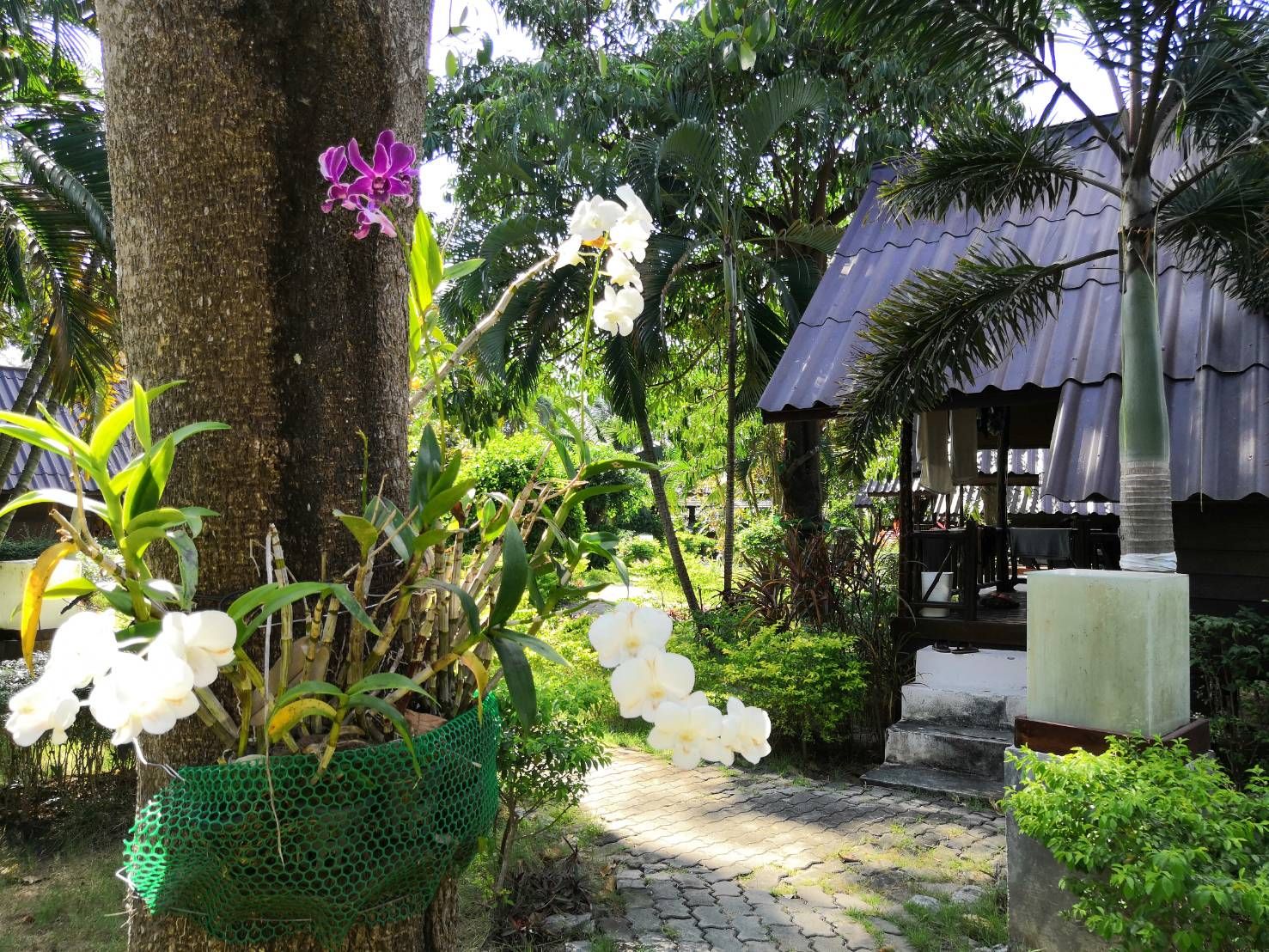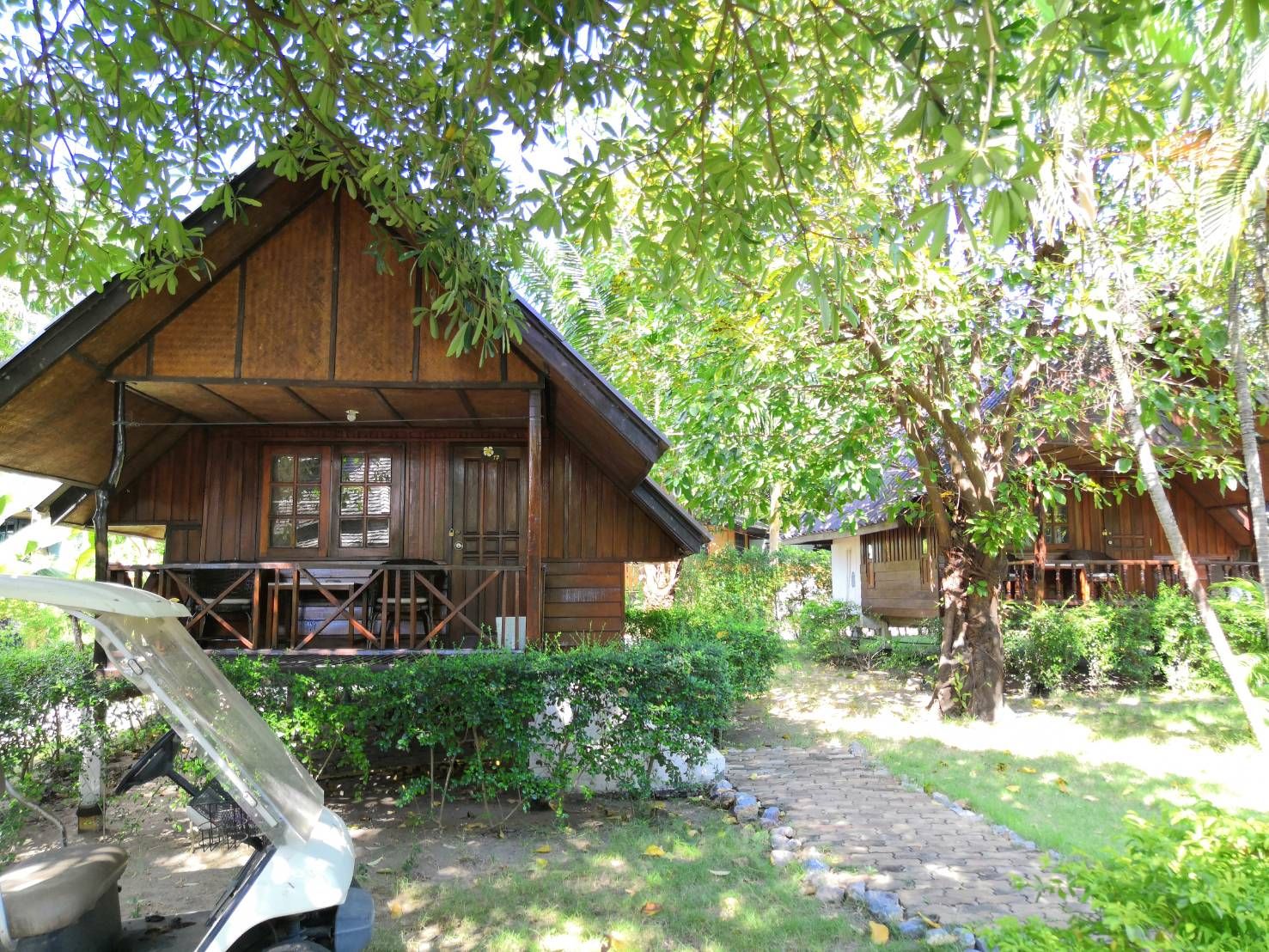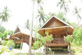 Traditional Thai-style wooden bungalows in a tropical garden setting.